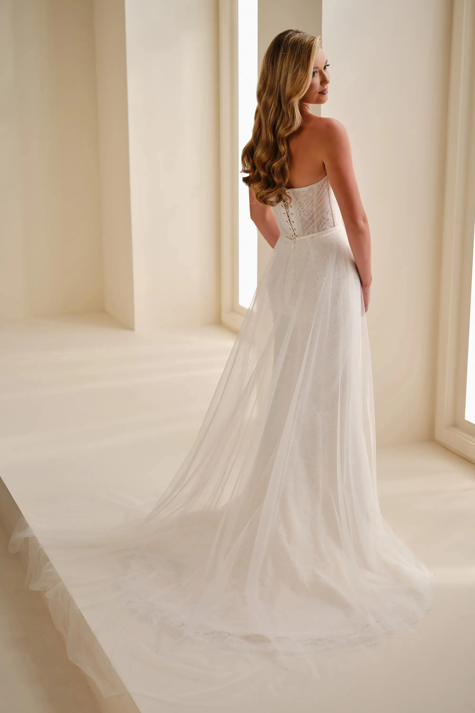 This strapless fit-and-flare gown features a stunning A-line glitter tulle overskirt layered over delicate Chantilly lace. The structured corset back offers support, and the long train gives this dress a timeless silhouette.